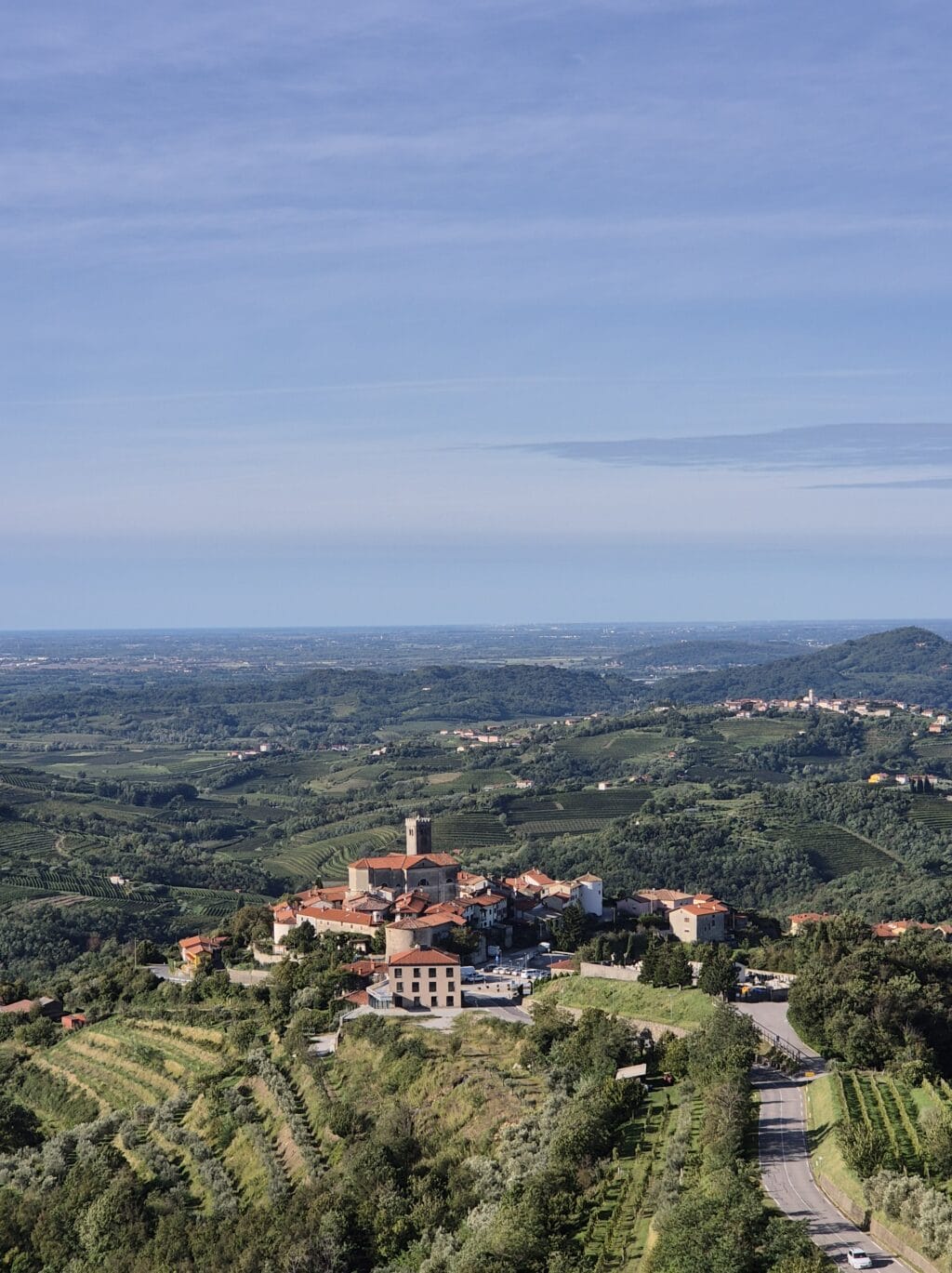 Bei herrlichem Herbstwetter starten wir am Morgen unsere Weiterfahrt in Richtung Brda. Zunächst erklimmen wir – wer will – den Aussichtsturm Gonjače. Der Wind weht uns kräftig um die Ohren, doch der Panoramablick über die Weinregion ist atemberaubend. Nur unweit entfernt liegt das malerische Dorf Šmartno. Ein kleiner Spaziergang durch den Ort und ein Blick in die kleine Dorfkirche lassen uns mehr über das ländliche Leben Sloweniens erahnen. Kleine Marktstände und lokale Läden bieten hausgemachte Geschenkideen an.