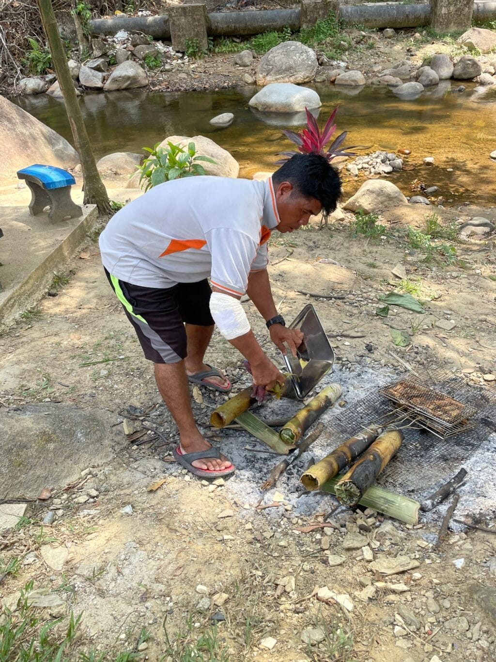 Am nächsten Tag werden wir Bekanntschaft machen mit den Ureinwohnern Malaysias, den Orang Asli. Das indigene Volk macht einen kleinen Prozentsatz der Landesbevölkerung aus. Die Orang Asli bewirten uns mit Köstlichkeiten aus ihrer traditionellen Küche. Eine typische Speise ist Ayam Pansoh. Diese wird aus Pouletfleisch oder Fisch zubereitet und mit verschiedenen aromatischen Zutaten angereichert in Bambusrohren über dem offenen Feuer gegart. Nach dem Frühstück verlassen wir Kuala Lumpur. War es in der Stadt eben noch gut 35 Grad heiss, so herrschen hier in den Cameron Highlands angenehme 25 Grad. Die Strasse führt kilometerlang durch Teeplantagen, links und rechts kommt ab und zu ein kleines Restaurant oder ein Verkaufsstand. Die Häuser sind stark geprägt von der kolonialen englischen Vergangenheit, weisen aber auch typisch chinesische Stilelemente auf.