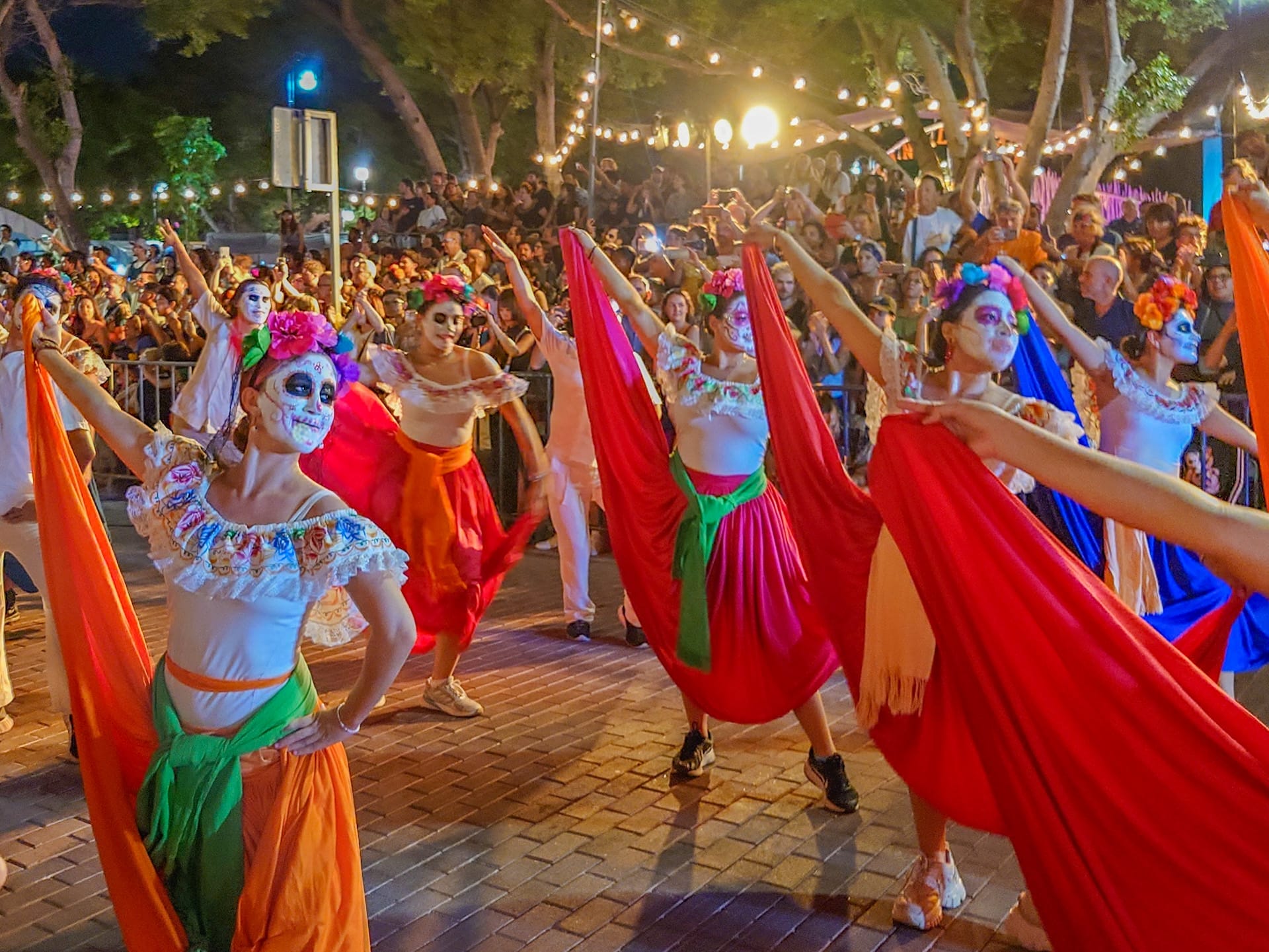 Die Feierlichkeiten werden lokal sehr unterschiedlich begangen; in Yucatán mit einem nach wie vor hohen indigenen Bevölkerungsanteil werden teilweise einzigartige Rituale zelebriert. Im kleinen Dorf Pomuch starten die Feiertage mit der Reinigung der Gebeine der Verstorbenen, welche anschliessend wieder liebevoll in die offenen Särge gebettet und im offenen Totenhäuschen platziert werden. Bei einem Friedhof-Spaziergang durften wir die freudige Stimmung in Erwartung des Besuchs aus dem Jenseits erleben und die offenen Totenhäuschen sehen. Zur Krönung der Feiertage wird vielerorts ein Umzug mit festlich und farbenfroh gekleideten Catrinas/Catríns (Skelett-Damen/-Herren) veranstaltet. So auch in der Stadt Mérida, wo wir mittendrin dabei waren, als der farbenfrohe Umzug zum Abschluss des eine Woche dauernden Festival de las Ánimas (Fest der Seelen) durch die Innenstadt zog.