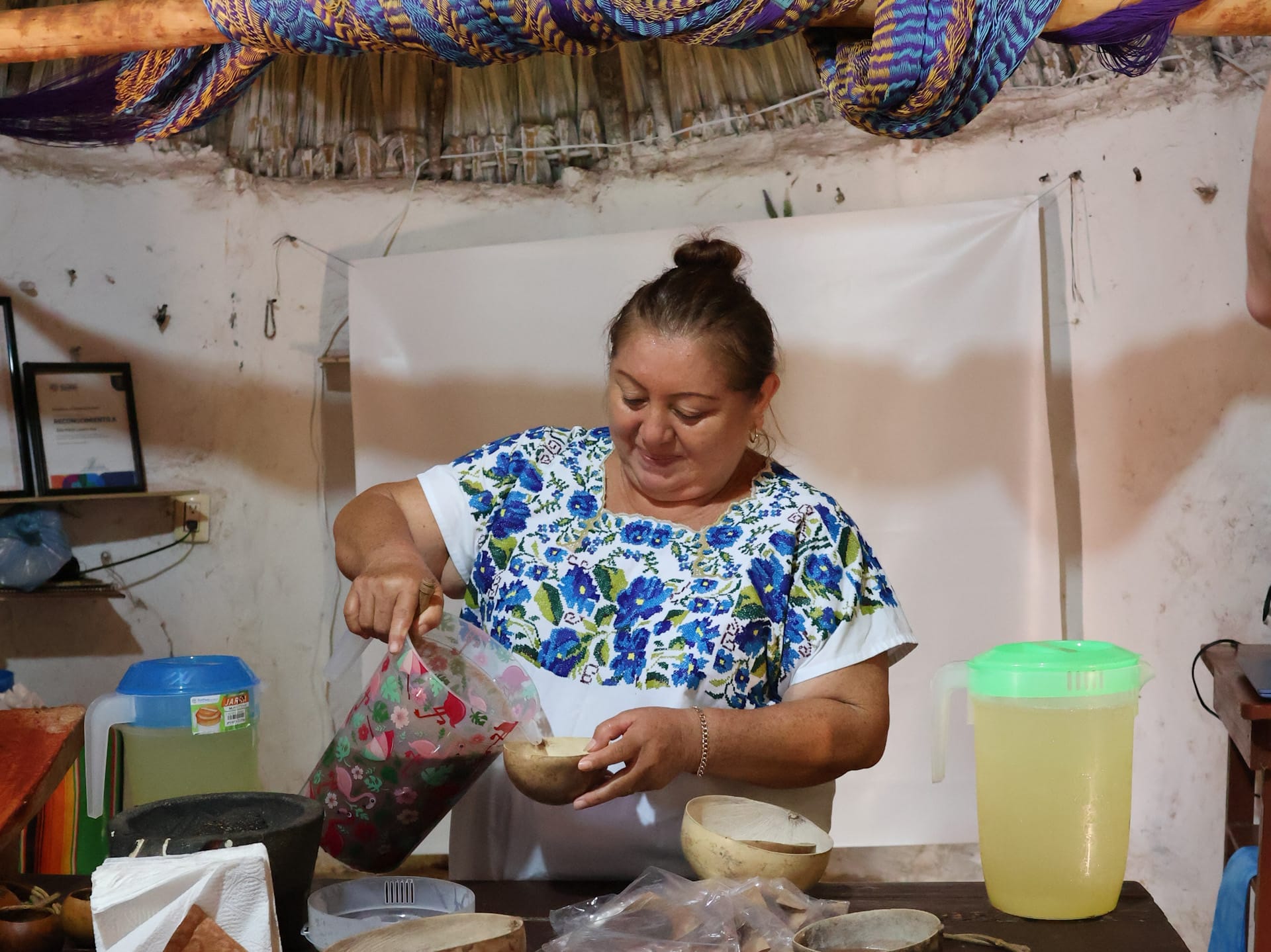Eine weitere starke Frau besuchten wir in Bécal, dem Zentrum der Jipi-Japa-Sombreros, welche im Rest der Welt als Panama Hüte bekannt sind. Die aufgeweckte Doña Chari lernte bereits als Mädchen das aufwändige Kunsthandwerk des Hutflechtens. Gemeinsam mit ihrem Mann Erminio zeigte sie uns den Produktionsprozess von der Ernte und Veredelung der Palmblätter über die aufwändige Flecht-Handarbeit in der Kellerhöhle bis zum fertigen Strohhut im Verkaufsladen. Passend zum Día de Muertos (Allerseelen), an welchem wir Doña Chari besuchten, hatte sie eine spontane Überraschung für uns bereit: Sie kleidete eine Reiseteilnehmerin als Catrina (Skelett-Dame) ein.