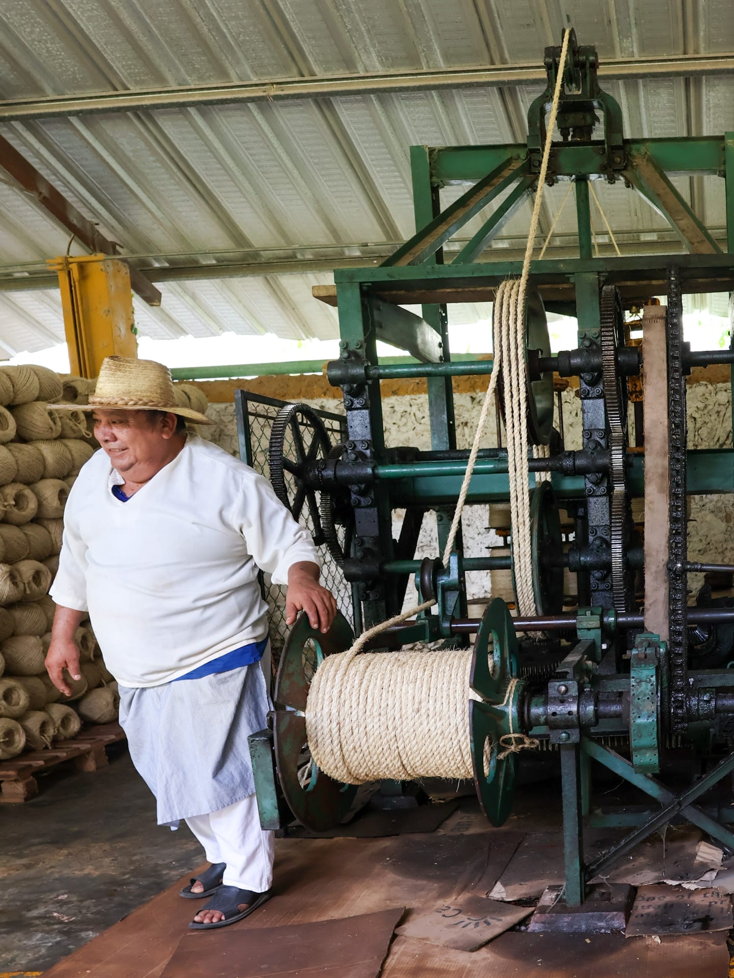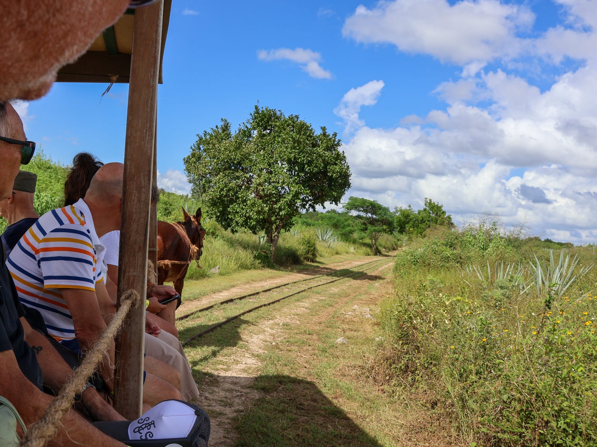 Wir konnten den ganzen Sisal-Produktionsprozess kennenlernen – von der Extraktion der Sisal-Fasern aus den Henequen-Agaven bis zum fertigen Seil. Zum Abschluss stiegen wir auf einen offenen Bahnwagen, welcher früher für den Transport der geernteten Agaven genutzt wurde. Gezogen von einem Maultier kurvten wir durch die alten Henequen-Plantagen zu einer Cenote (Wasserloch), welche ebenfalls zur Hacienda gehört. Nach einem erfrischenden Bad in der Höhle ging es zurück zur Hacienda, wo ein leckeres Mittagessen wartete.