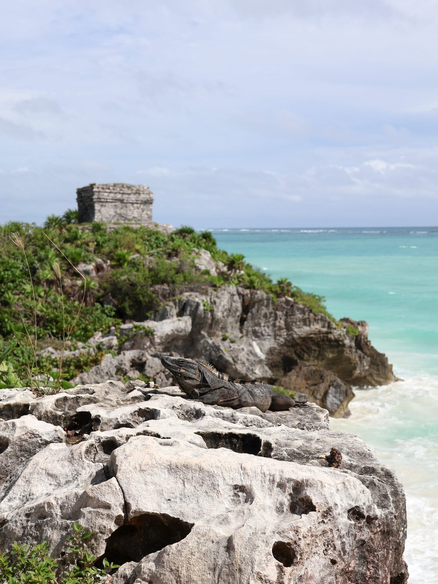 Trotz frühem Start am nächsten Morgen gerieten wir auf der Fahrt zu den Ruinen von Tulum in den Stau – und machten eine spannende Beobachtung: Auf der offiziell zweispurigen Fahrbahn bildeten sich im nu drei und teilweise sogar vier Spuren Kolonnenverkehr. Mexikanischer Pragmatismus at its best… So ging es trotzdem stetig vorwärts und wir erreichten die auf einer hohen Klippe über dem türkis leuchtenden Meer gelegenen Maya-Ruinen vor dem grössten Besucheransturm. Nicht nur die Überreste der antiken Bauten und die fantastische Aussicht auf das Karibische Meer liessen mein Herz höher schlagen, sondern auch die unzähligen Leguane, welche auf den Ruinen an der Sonne fläzten.
