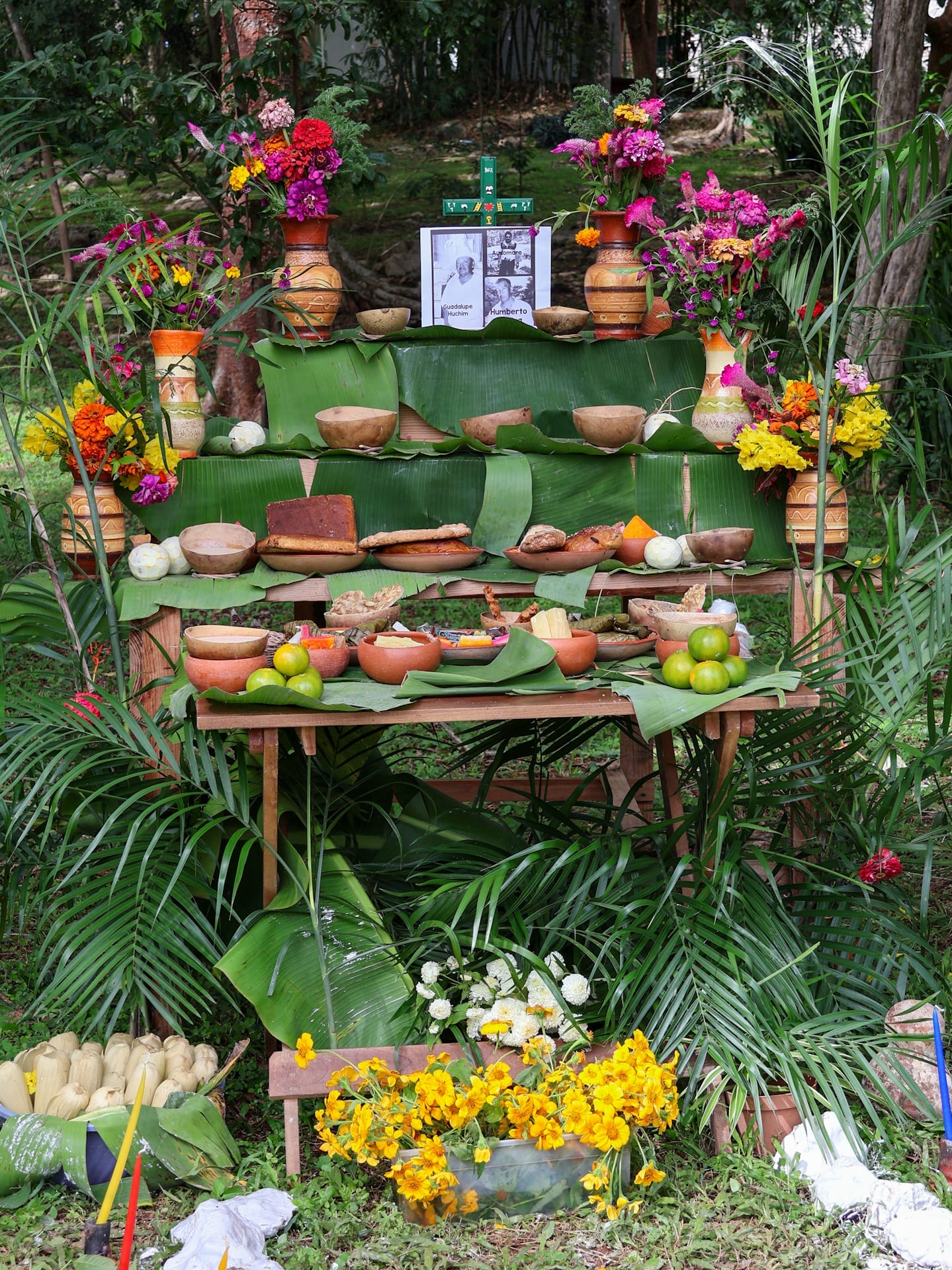 Ebenfalls ganz im Zeichen der Día de Muertos Traditionen stand der Kochworkshop zu Hause bei einer Maya-Familie. Wir wurden mit frischen Früchten, Fruchtsaft und dem traditionellen Pan de Muerto, ein Gebäck welches ähnlich schmeckt wie unser Dreikönigskuchen, im Haupthaus begrüsst. Anschliessend bereiteten wir im Garten gemeinsam mit Gladys’ Familie traditionelle Mukbilpollos zu: In Bananenblätter eingepackte, mit Poulet und Tomatensauce gefüllte Maisbrei-Torten, welche während rund zwei Stunden im Erdofen gebacken werden und in dieser Form nur für die Día de Muertos Feier zubereitet werden.